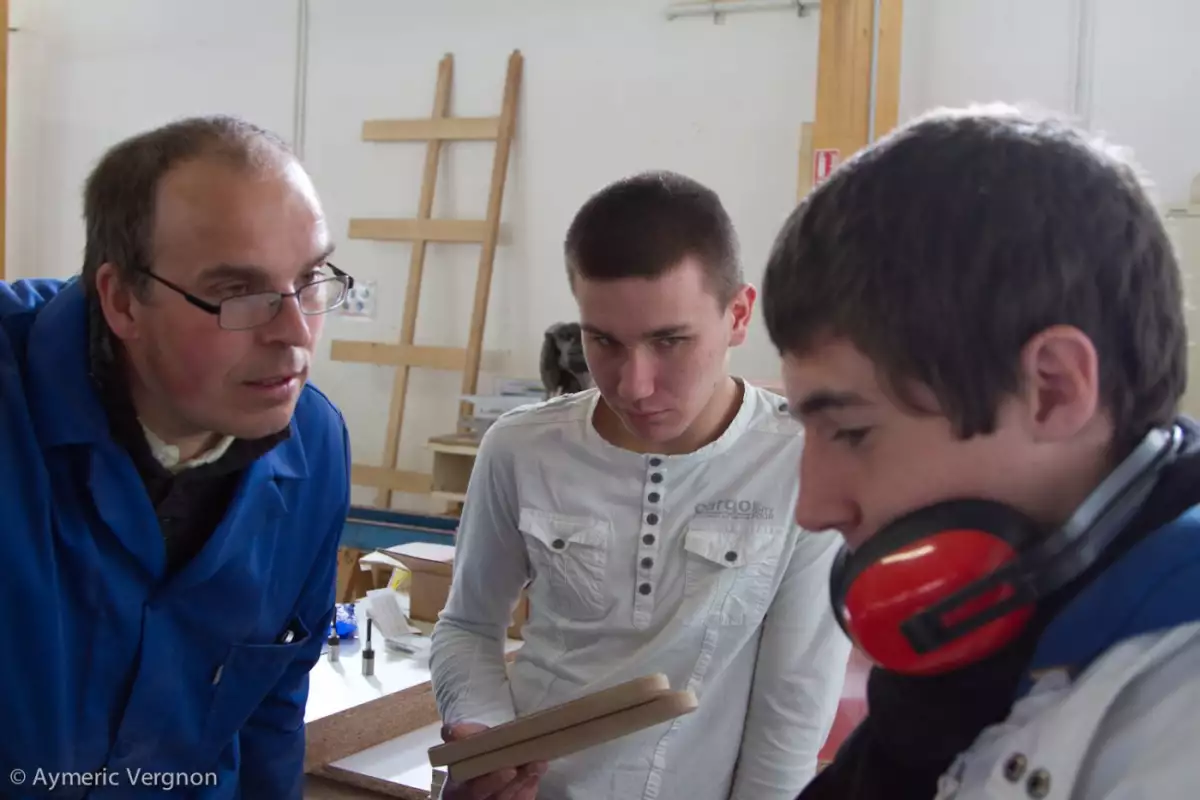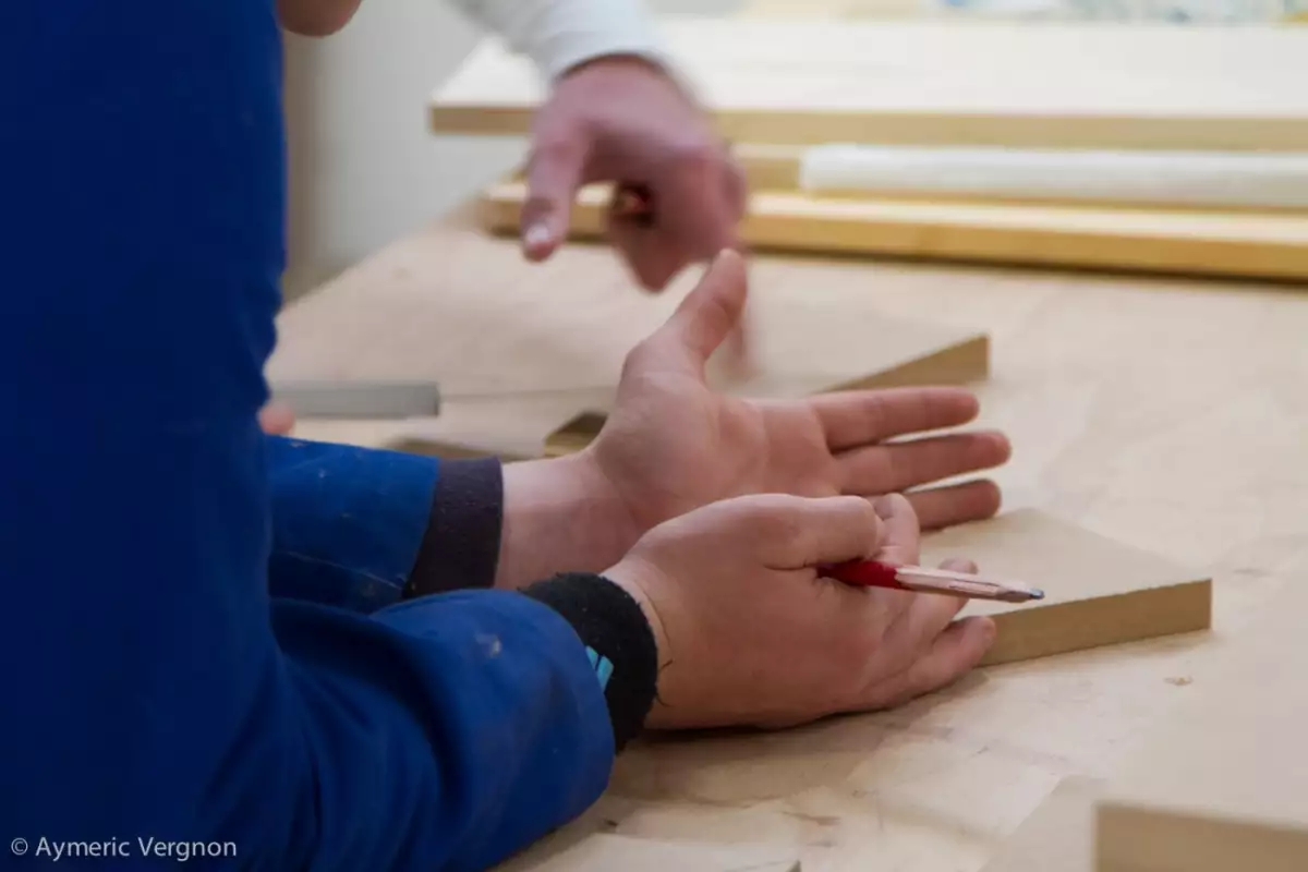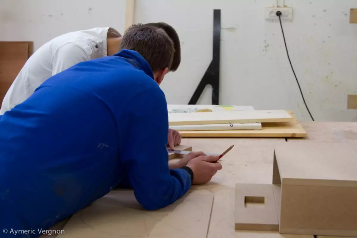 J’ai travaillé avec un groupe d’apprentis-menuisiers du lycée Jules Verne (Etaples). Il s’agissait d’utiliser leurs compétences pour un projet artistique et ainsi leur permettre d’appréhender leur métier dans un geste plus libre. Je leur ai proposé une sorte de boite noire, moitié camera obscura, moitié outil de projection. Chaque groupe a cherché une manière de faire défiler des images dans ces boites.