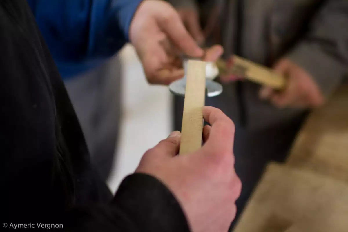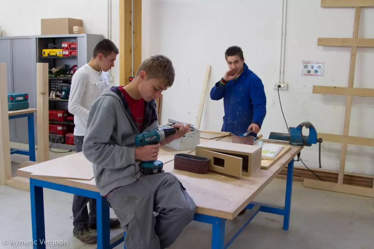 J’ai travaillé avec un groupe d’apprentis-menuisiers du lycée Jules Verne (Etaples). Il s’agissait d’utiliser leurs compétences pour un projet artistique et ainsi leur permettre d’appréhender leur métier dans un geste plus libre. Je leur ai proposé une sorte de boite noire, moitié camera obscura, moitié outil de projection. Chaque groupe a cherché une manière de faire défiler des images dans ces boites.
