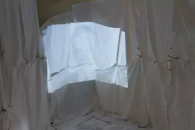 A la séance suivante, nous avons construit dans le hall du lycée une « maison » en draps blancs. A l’intérieur j’ai projeté les visages fantomatiques des lycéens et dans l’intervalle une ombre blanche sortant de la mer.